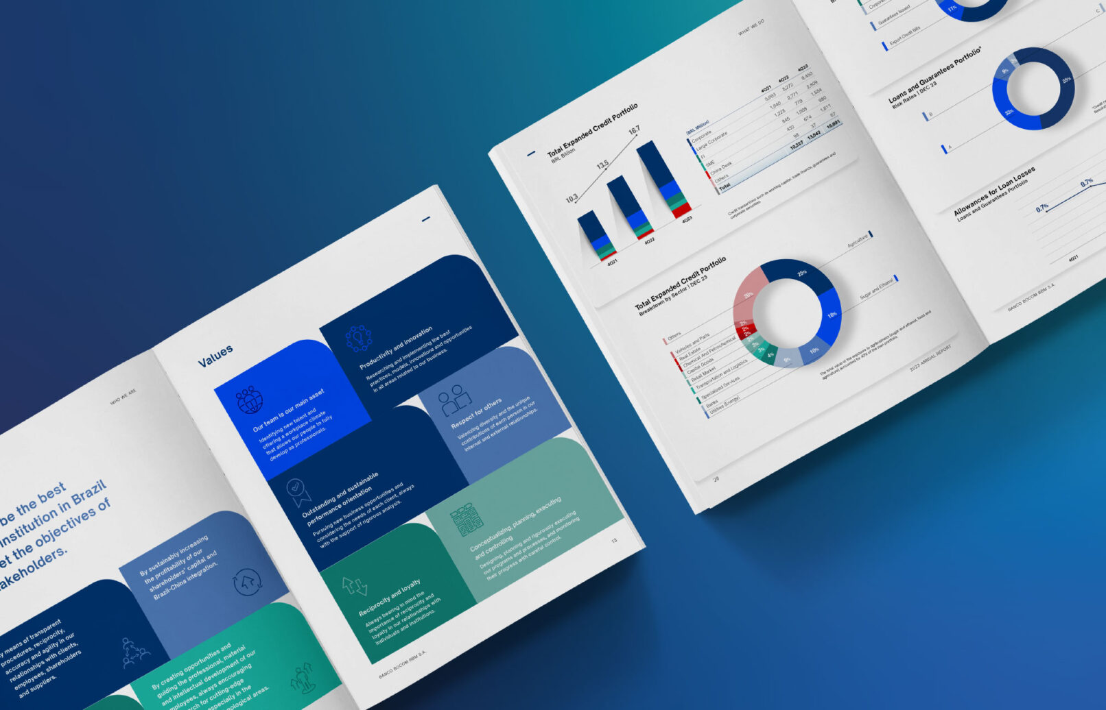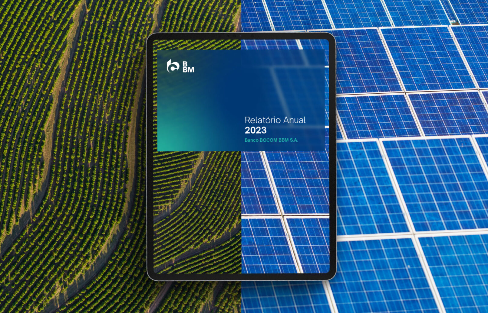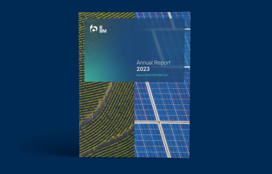 O Relatório Anual 2023 do BOCOM BBM marca a primeira grande aplicação da nova Identidade Visual do Banco, refletindo um tom mais contemporâneo e sustentável.