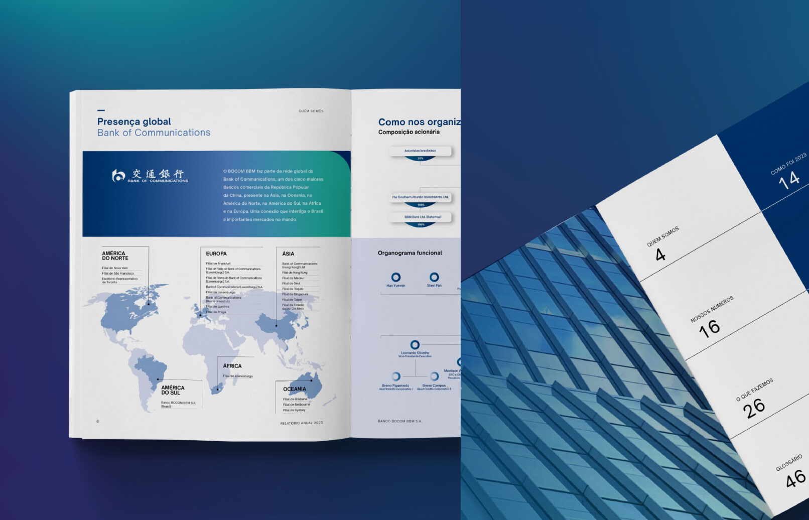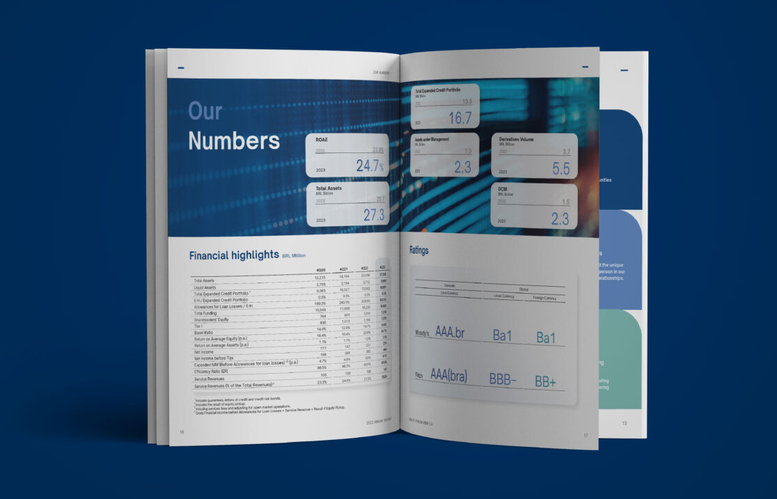 Foram desenvolvidas três versões – impressa, digital e hotsite – em Português, Inglês e Mandarim. O projeto gráfico incorpora cores mais vivas e tecnológicas e formas suavizadas, criando uma estética atualizada e elegante. A proposta aqui é comunicar resultados, além de fortalecer a transparência e credibilidade do Banco no mercado